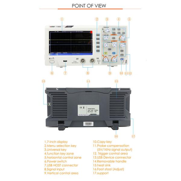 VICTOR 1100S and 1050S is a super-economical type digital storage oscilloscope.The 2-channel oscilloscope has 100MHz or 50MHz bandwidth.Ultra-thin body, designed with 7-inch high resolution LCD.Support for SCPI, and for LabVIEW.